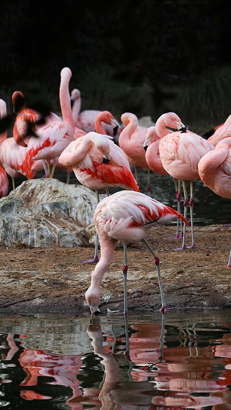 Donning pale pink plumage, Chilean flamingos have distinctive greyish legs with pink “knees” and more crimson wing coverts. Their large bill is mostly pale with a wide black tip. These highly social birds exhibit synchronised mating and nesting seasons. Migrating in groups, Chilean flamingos’ flying patterns follow skeins (V-formation), with their necks and legs stretched in a straight line.