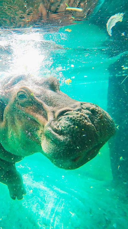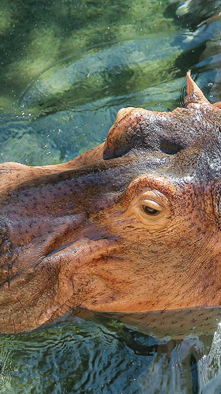 One of the heaviest land animals, the hippopotamus has a size and weight comparable to that of the rhinoceros. Its name comes from the Greek for “river horse,” a nod to the hippopotamus’ habitat and its water-loving nature, as well as its ability to stay submerged for up to 5 minutes, even while asleep.