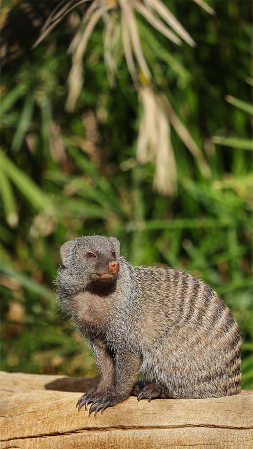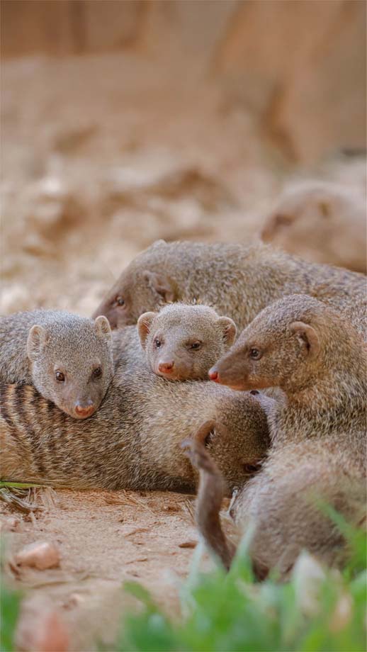The mongoose is a sleek, agile mammal belonging to the family Herpestidae. Most types of mongoose usually have long bodies, short legs, and tapering tails, with fur that ranges from grey-brown to sandy, often marked with grizzled patterns or faint stripes. Its pointed snout and small, rounded ears give it a weasel-like appearance. Many species are renowned for their bold behaviour, including their ability to confront and even defeat venomous snakes.